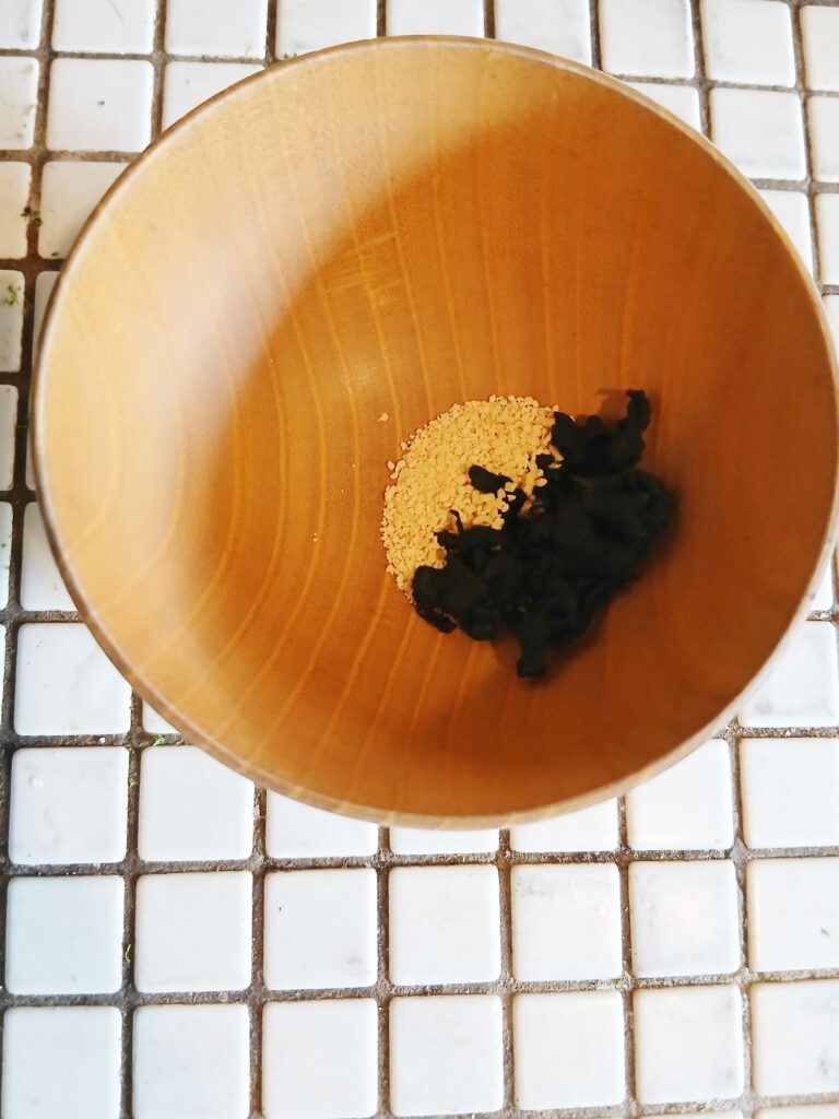 ①乾燥わかめと、鶏ガラ1人前は小さじ1
