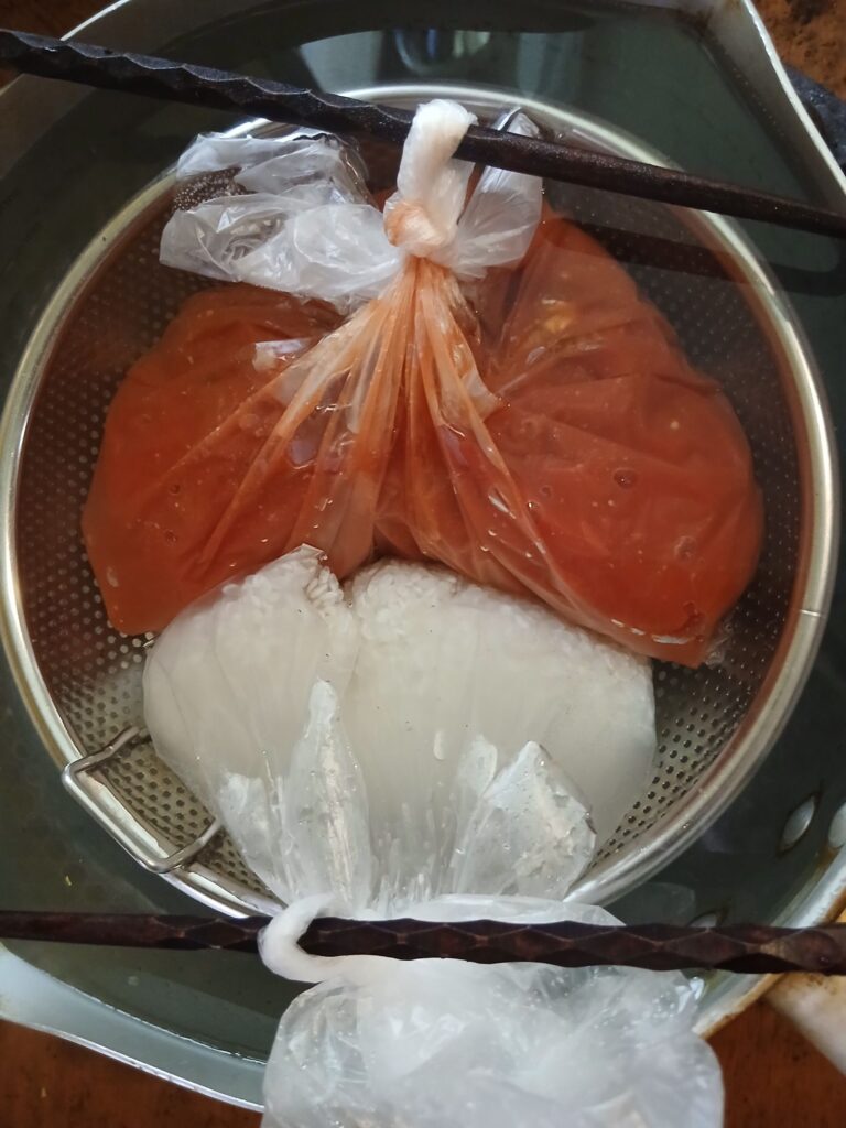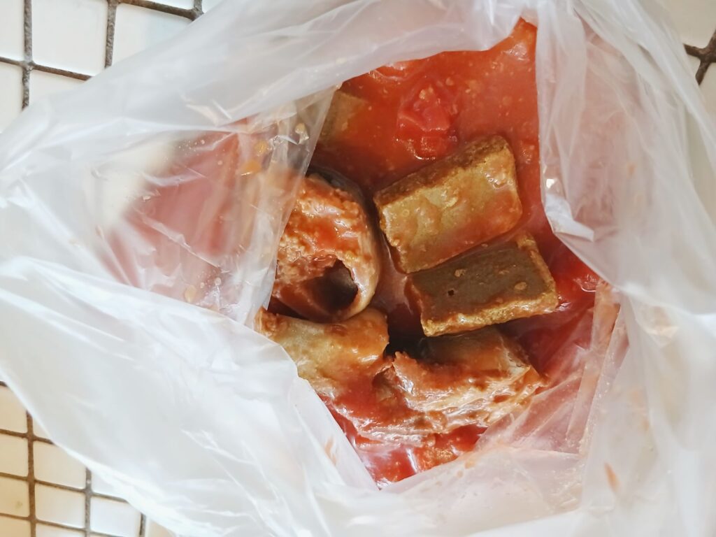 ①アイラップにさば缶、トマト缶、カレールーをいれて、空気を抜き硬く結ぶ